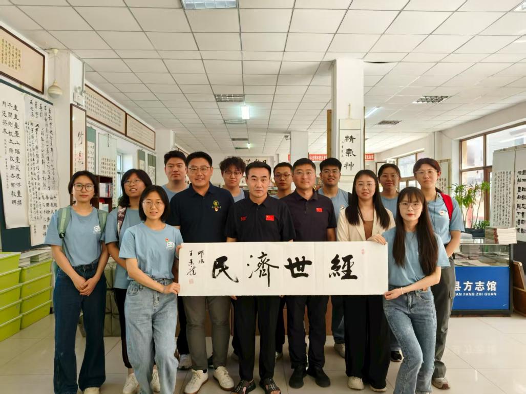 第二站,调研团队来到明水县方志馆,基层文化工作者的坚守与担当让师生感触颇深,馆长王景龙向调研队伍展示了《明水百年故事》《明水图志》等书籍,并细细讲述了方志馆筹建期间的艰难求索,以及年鉴编写过程中字斟句酌的严谨执着。副院长伏霖从学术视角解读了方志价值,其作为“长周期数据库”为经济史、社会史研究提供了源头活水。临别之际,馆长王景龙亲笔题写“经世济民”四个大字,以此寄托对调研团队的殷切祝愿。