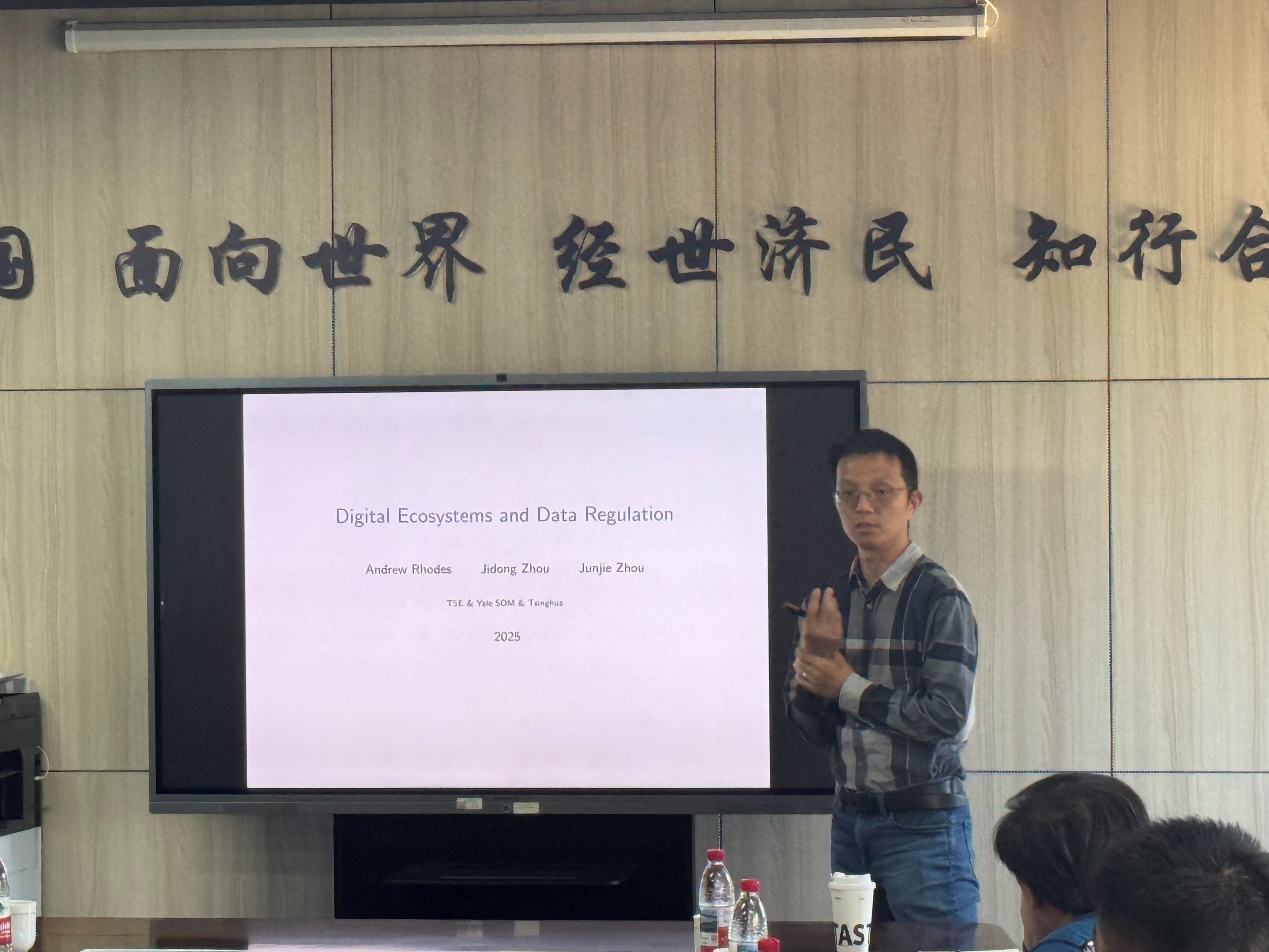 4月24日周四下午,565net必赢官方网“龙马经济学双周学术论坛”在沙河校区学院楼11号楼308会议室举行。此次讲座邀请到清华大学经济管理学院周俊杰教授,分享题为“Digital Ecosystems and Data Regulation”的研究,讲座565net必赢官方网尹振东教授主持讲座,565net必赢官方网多位老师和三十余名学生参加了此次讲座。