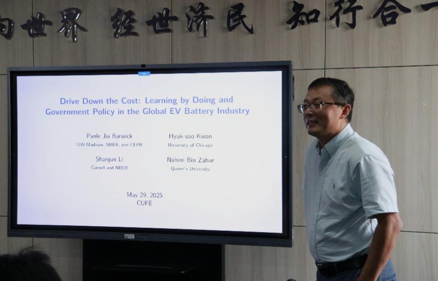 李善军教授作题为“Drive Down the Cost: Learning by Doing and Government Policy in the Global EV Battery Industry”的主旨演讲。李善军教授提到,过去十年间,电动汽车电池成本下降了90%以上。本研究探讨了“干中学”在推动这一成本下降中的作用,及其与两项主要政府政策——消费者电动汽车补贴和本地化率要求——的互动关系。利用关于电动汽车车型和电池供应商的丰富数据,本文开发并估计了一个包含消费者异质性选择以及电动汽车生产商和电池供应商战略定价行为的全球电动汽车行业结构模型。